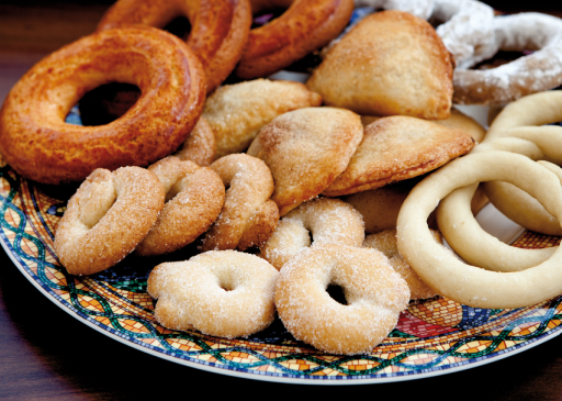 Rollos de anís, vino y naranja, empanadillas de cabello de ángel y boniato, toñas, empanadas saladas y tortas saladas.